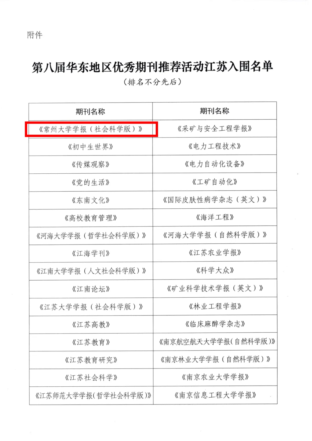 近日,《常州大学学报(社会科学版)》荣获“第八届华东地区优秀期刊”,这是本刊今年继荣获“江苏期刊明珠奖·优秀期刊”后的又一佳绩。